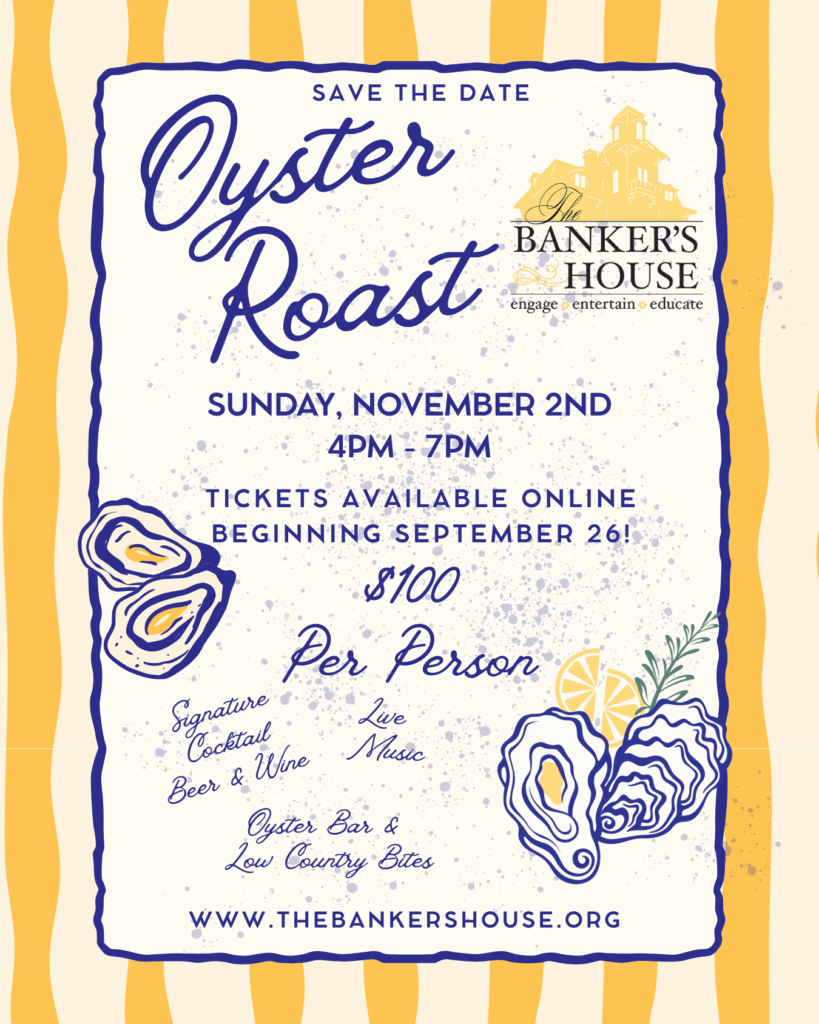 Join us at The Banker’s House for an unforgettable Oyster Roast on Sunday, November 2, from 4–7 p.m.